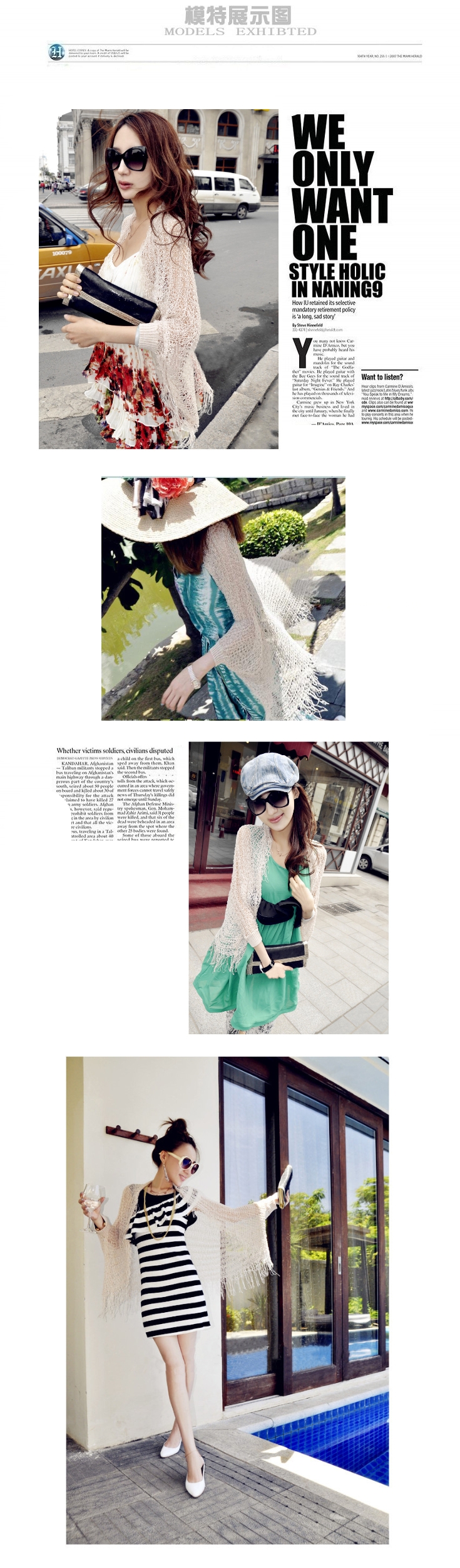 这款是带7分袖毛衣钩织披肩.镂空钩花的设计,不会给您带来累赘.让你百搭各种YY,丰富衣服的美感,尽显甜美女人,衣橱必不可少的一款四季皆可穿的YY.质感不错哦.由于尺寸是平铺衡量,各人量法不同,难免存在2CM的差距,请谅解