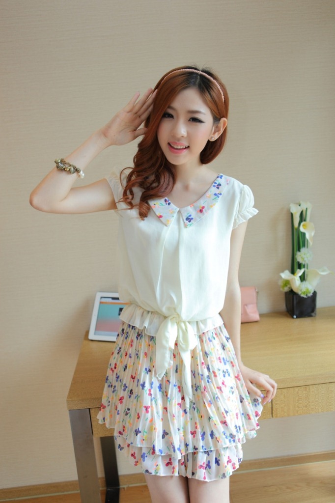 【品名/Trade name】 实拍2013夏季韩版娃娃领压折花色拼接雪纺连衣裙