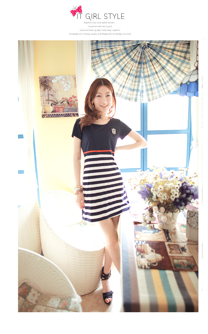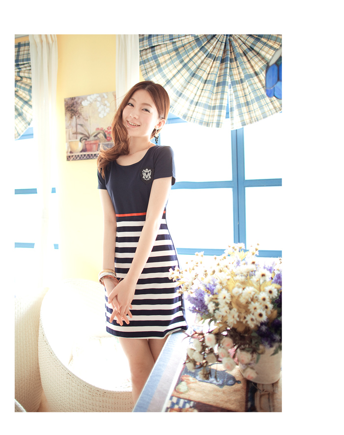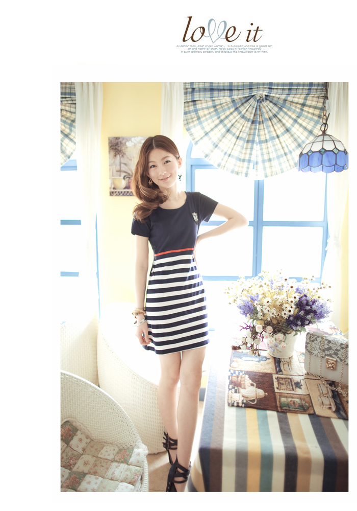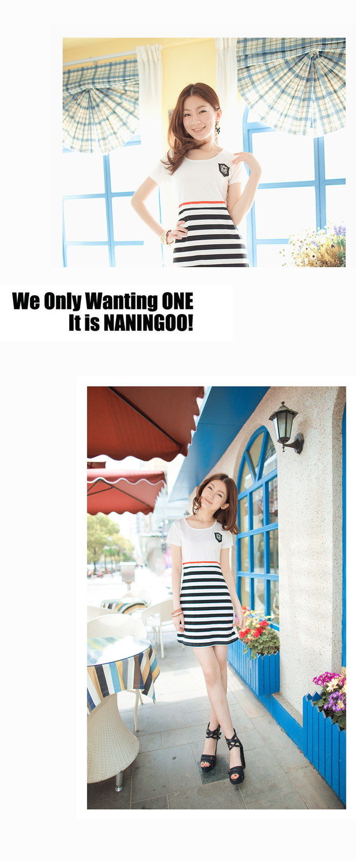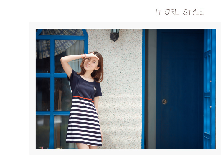 特点及试穿报告:时尚经典的条纹拼接,大方简约的百搭效果,加上腰围处,一条红丝带的衔接,左胸围出,胸章衔接,面料舒适透气,款式简单大方,不错的选择,夏天必备!