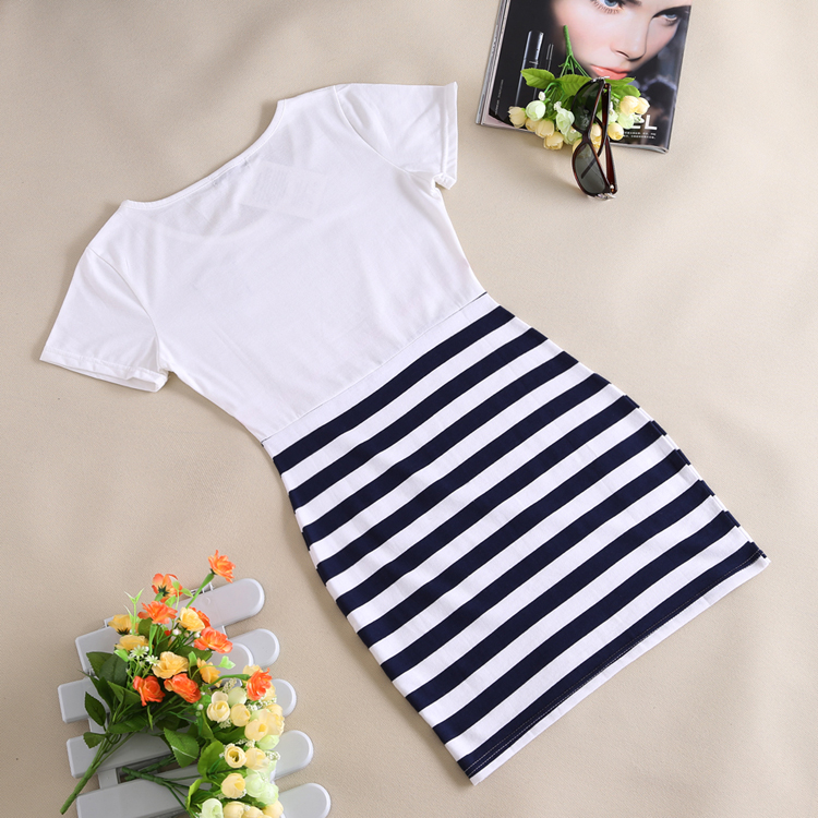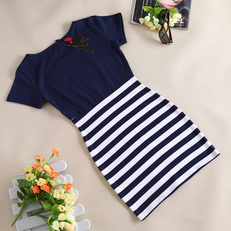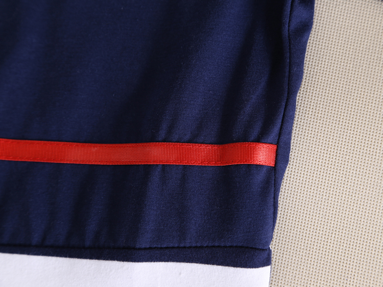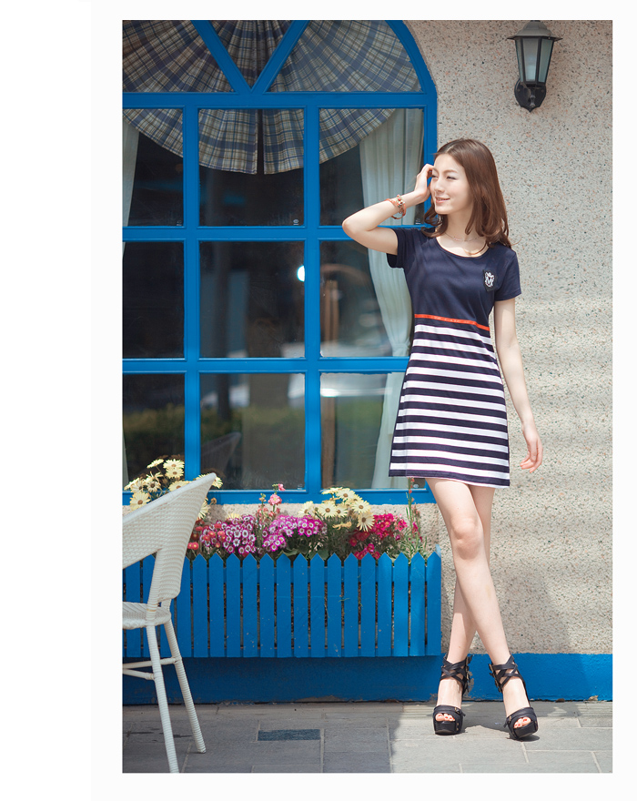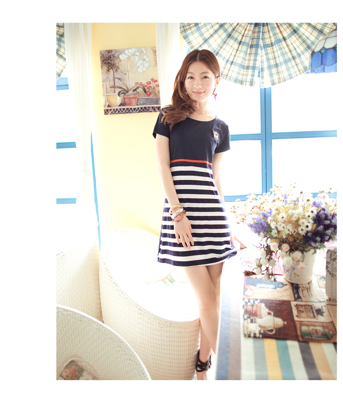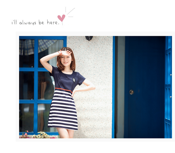特点及试穿报告:时尚经典的条纹拼接,大方简约的百搭效果,加上腰围处,一条红丝带的衔接,左胸围出,胸章衔接,面料舒适透气,款式简单大方,不错的选择,夏天必备!