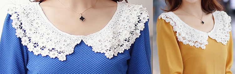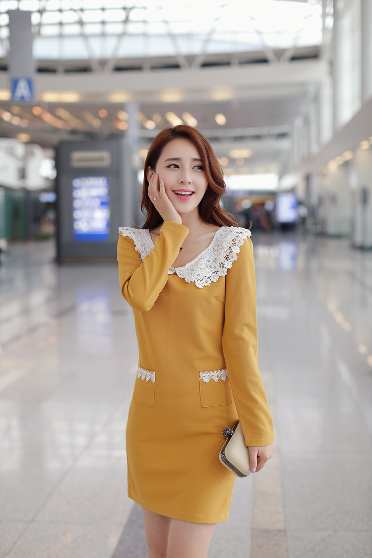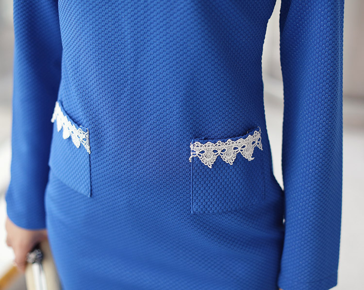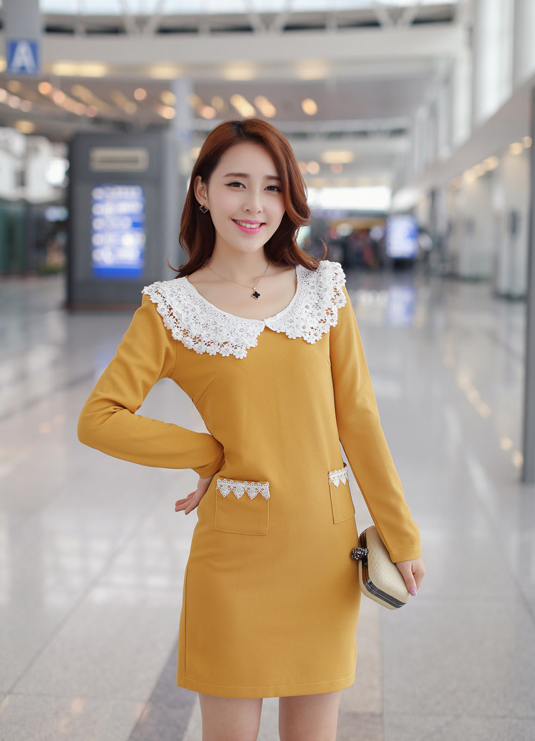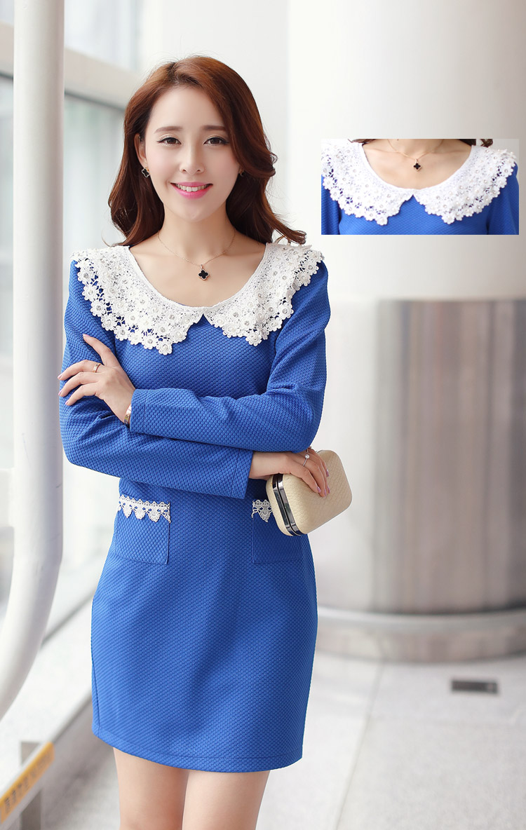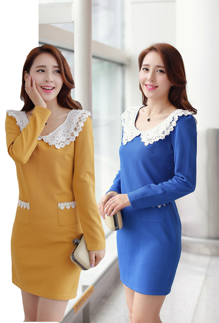 1025#模特实拍新款秋装 OL修身娃娃领订珠蕾丝花朵拼贴长袖连衣裙
