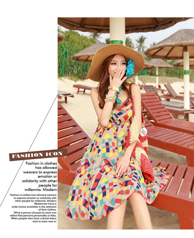 2014夏季韩版新款格子吊带裙 沙滩裙波西米亚连衣裙