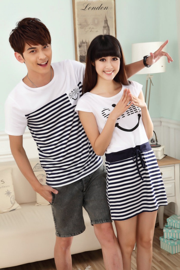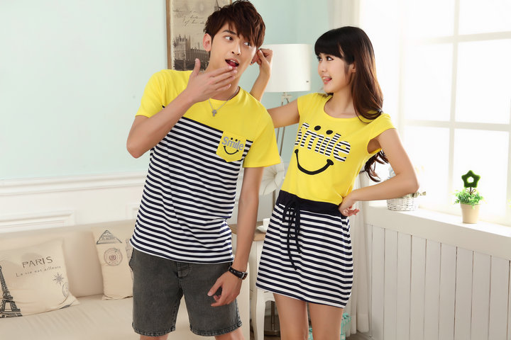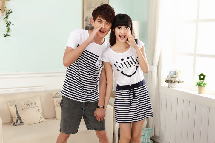 名称:新款情侣装夏装韩版笑脸圆领长款条纹女装情侣t恤衫