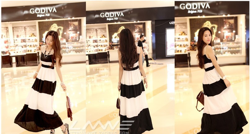 8990#夏装新款条纹连衣裙欧洲站黑白条纹波西米亚长裙大摆连衣裙