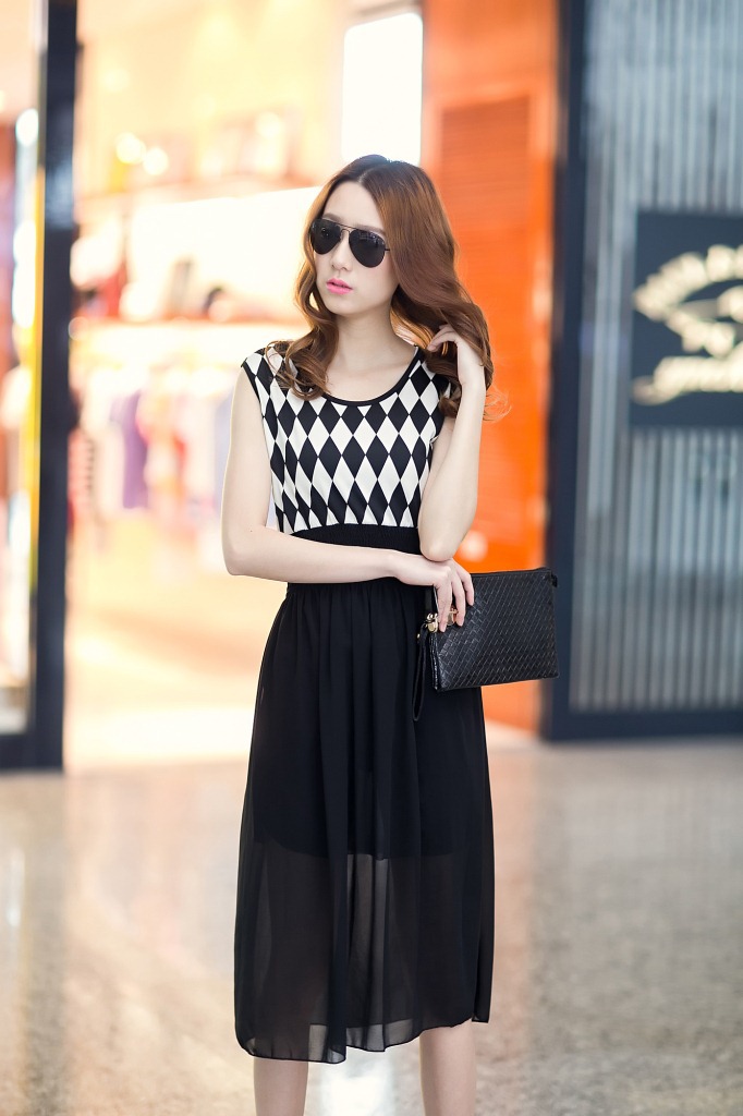 9050#实拍2014夏装复古花菱型格拼接雪纺女款连衣裙 洋装