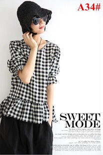 2013新夏文艺复古韩版黑白格圆领套头裙摆衬衫打底衫 亚麻 A34#