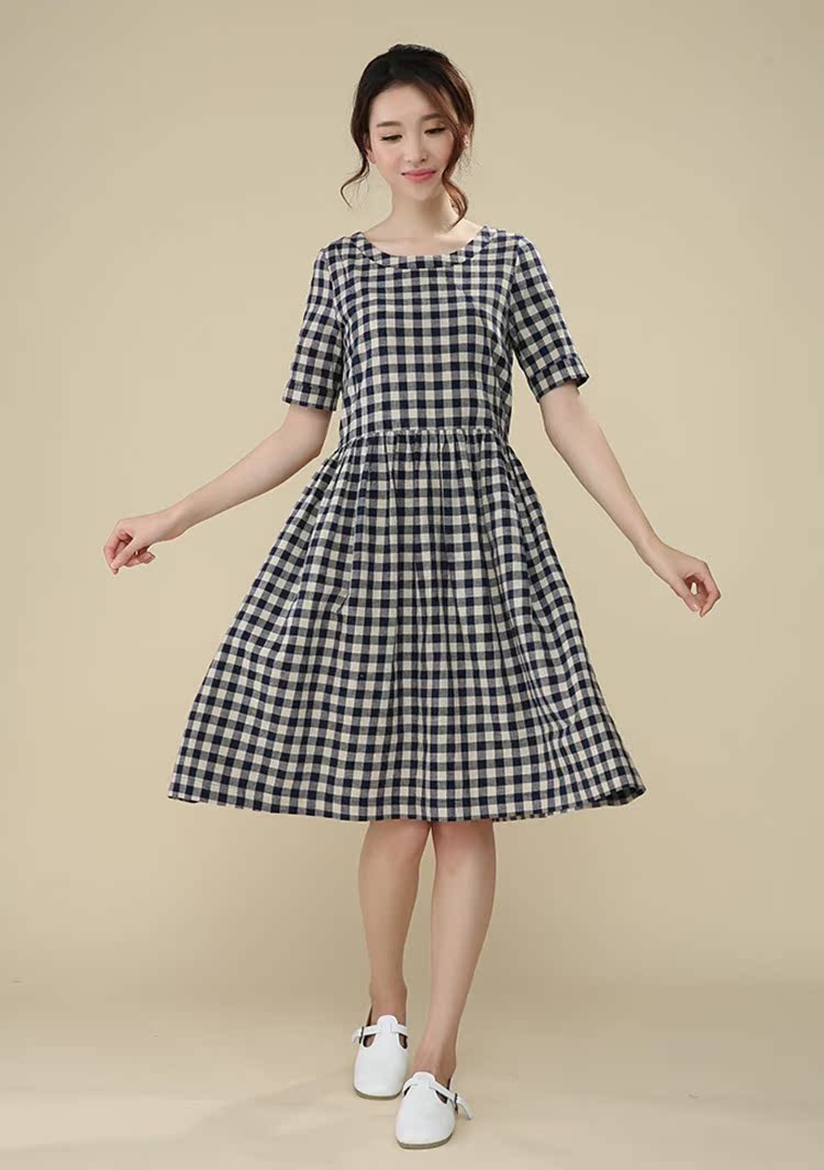 ELEON 2014春款复古 文艺范 学院 宽松棉麻长袖格子连衣裙A159#