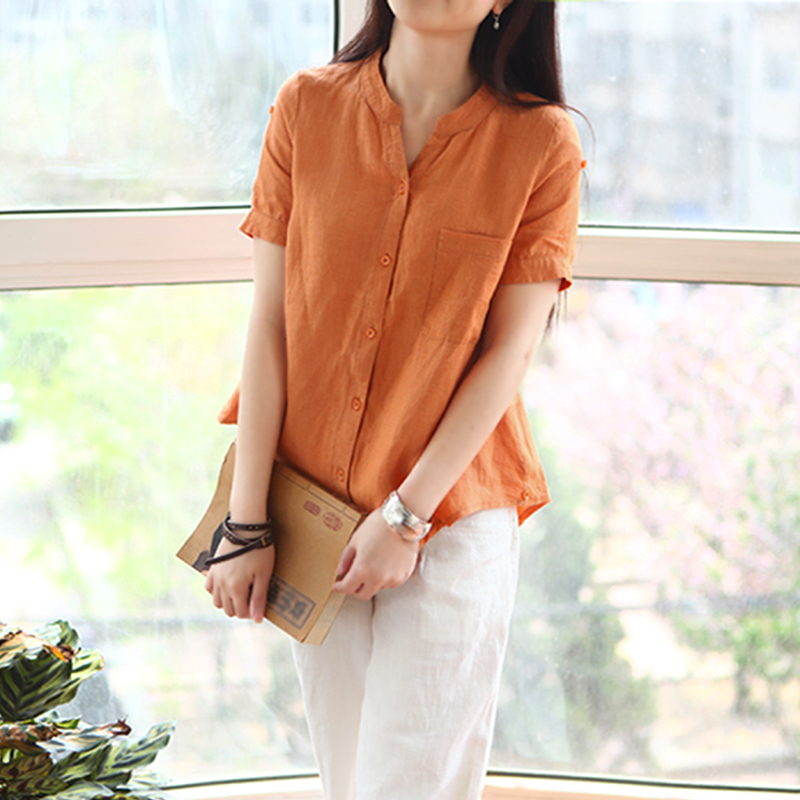 ELEON 2014秋 韩版 文艺范 亚麻 短袖衬衫 B030