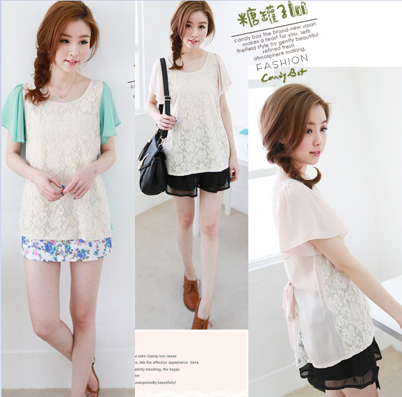 8319# 2014夏装新款韩版拼色雪纺花边宽松雪纺衫潮