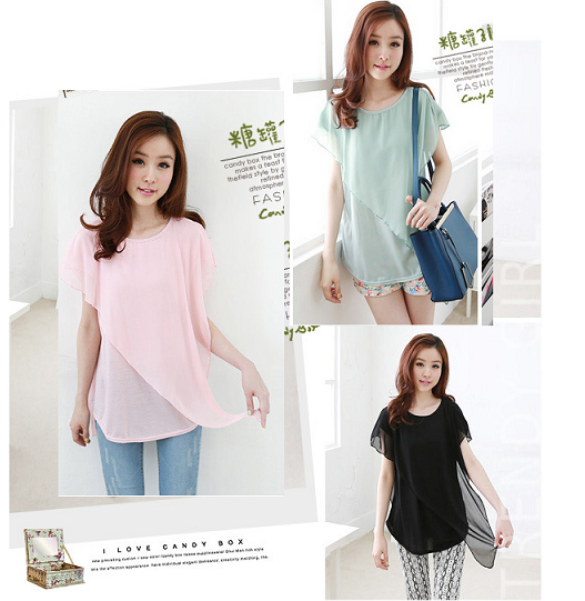 8362# 甜美休闲假兩件斜邊拼接雪纺短袖T恤 打底衫 女(优质款)