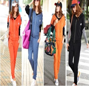 8332#2013爆款韩版连帽两件套可爱纯色拉链运动套装女